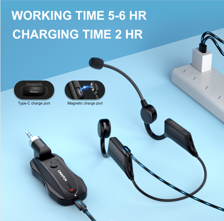 【Easy to Use】The 2.4G headset microphone adopts international 2.4 GHz wireless transmission which can connect automatically within 2s. Both transmitter and receiver are built-in rechargeable lithium batteries that can offer about 5-6 hours working time and fully charge is only 2 hours. Use 2 in 1 cable to charge for the transmitter and receiver simultaneously. 65 feet of range is perfect for many venues in an open area.