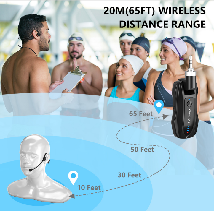 【Borned for Fitness】KM-GWP91 is a wireless waterproof microphone system with a detachable waterproof microphone head, included has 2pcs of waterproof mic head for your replacement. Ideal for swimming coach, yoga coach, fitness instructor, water aerobics coach, spinning coach, gym teacher, teaching, speech, church, promotion, dancing instructor, active performers and more.