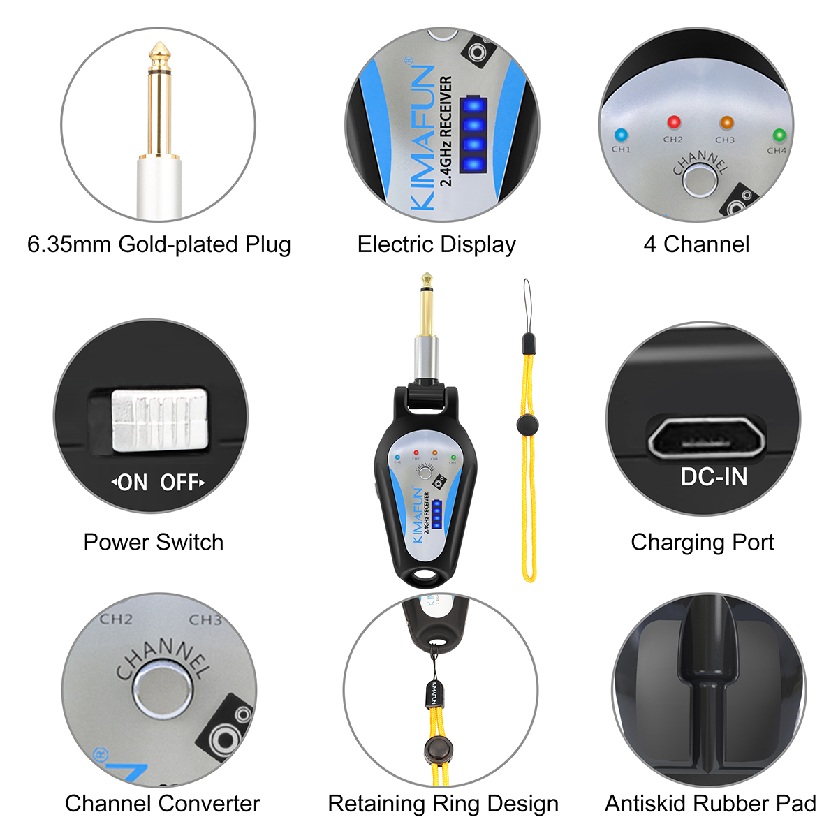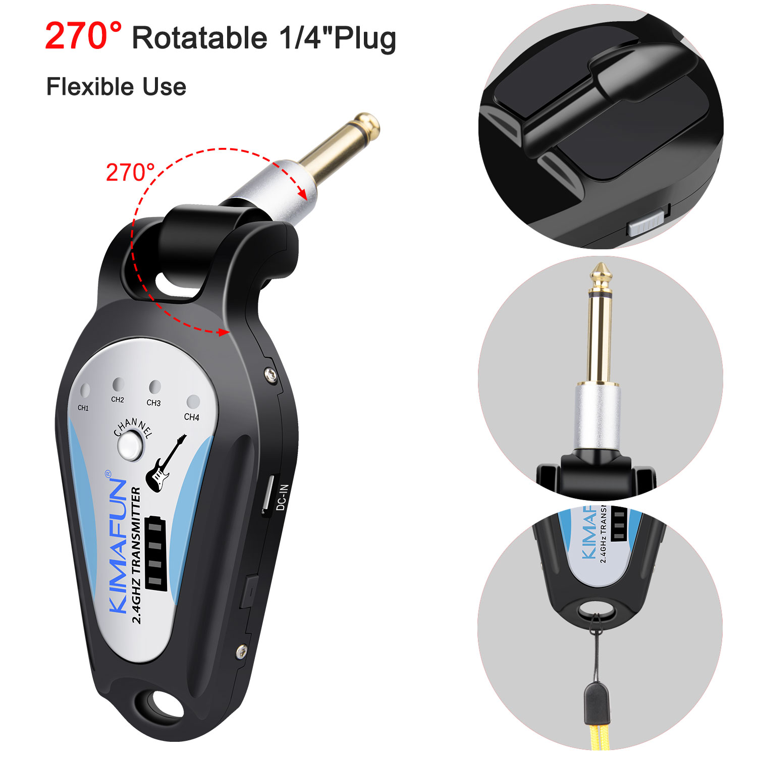 Sweet Design: 270° rotatable 1/4" plug, available for instruments with input jack in different positions. The soft pads on the back of the transmitter protect your music instruments’s surface. The volume degree can be adjusted by the volume button on the transmitter. The lanyard is designed to secure transmitter and avoid dropping and losing.